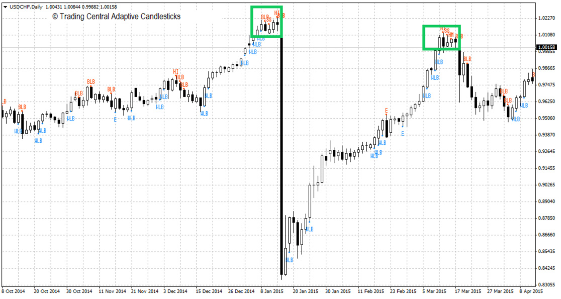Grafik harian USD/CHF, pada Januari 2015 dan Maret 2015 pasangan ini mengakumulasi pola reversal sebelum kemudian merosot tajam (persegi empat berwarna hijau).